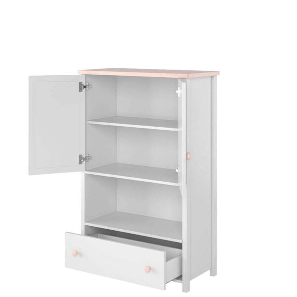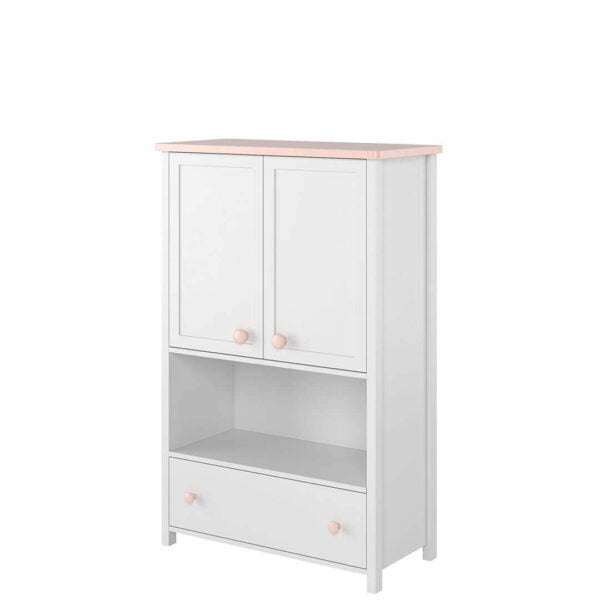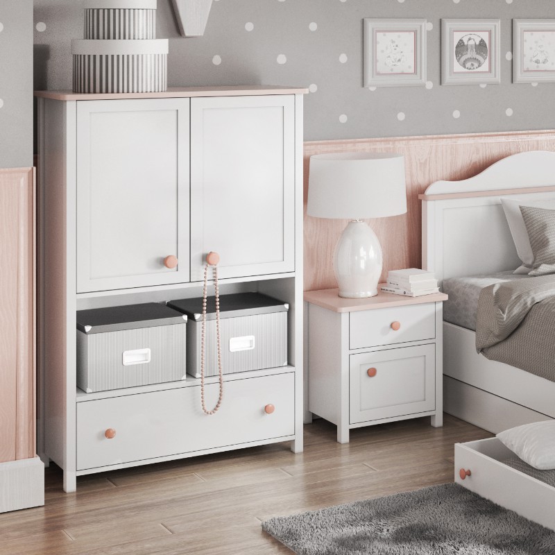 Nábytek se vyznačuje původním charakterem. Bílý korpus a pudrově růžová horní část a doplňky vytvářejí jedinečný styl, který osloví příznivce princezen.