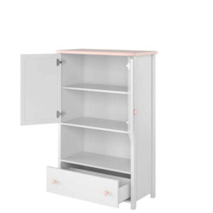 Stylová komoda se dvěma dvířky, policí na knihy nebo dekorace a prostornou a snadno přístupnou zásuvkou na prádlo nebo drobnosti.