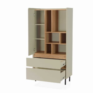 Horní část nábytku tvoří otevřené police, které umožňují vystavení knih, rostlin, dekorací nebo sbírek. Absence čel v této části poskytuje volný přístup k obsahu a umožňuje rychle uspořádat prostor podle vašich potřeb. Pod otevřenou částí se za jedním čelem dvířek nachází uzamykatelná přihrádka, která je ideální pro uložení věcí, které nemusí být na očích. Vedle ní výrobce umístil dvě praktické zásuvky, vhodné pro drobné příslušenství, dokumenty nebo textil.