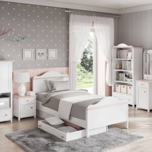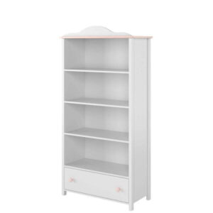 Stylová knihovna na knihy, učební pomůcky a dekorace. Nábytek se vyznačuje originálním charakterem. Pevná bílá barva, růžové detaily a originální povrchová úprava s charakteristickou jemnou vlnkou vytvářejí jedinečný styl, který osloví milovníky pohádek o princeznách.