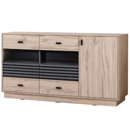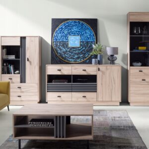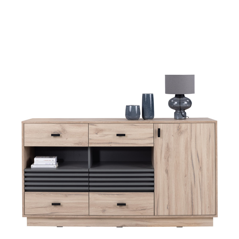 Ideální volbou do obývacího pokoje je komoda v provedení dub estana světlý/antracit ze série Allmo, jejíž konstrukční materiál je laminovaná dřevotříska. Komoda má dvířka a šest zásuvek pro snadný přístup do vnitřního prostoru. Komoda doplní také interiér obývacího pokoje nebo předsíně a poskytne praktické místo pro uložení menších i větších předmětů.
