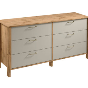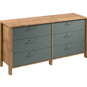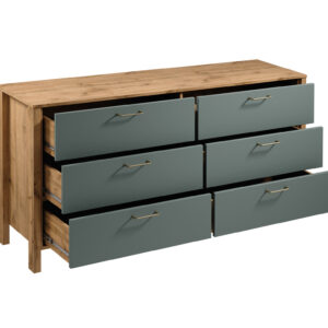 Přirozené zbarvení teplého dekoru dubu Wotan na korpusu nábytku v kombinaci s jednobarevnou béžovou nebo zelenou barvou dle vlastního výběru činí kolekci přirozeně krásnou.
