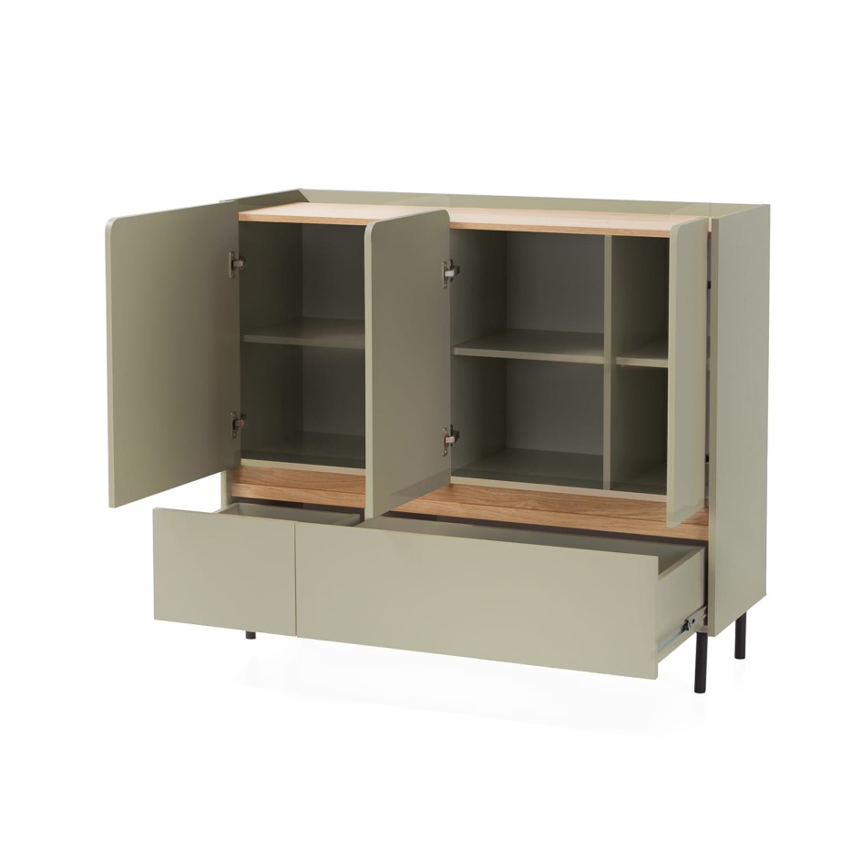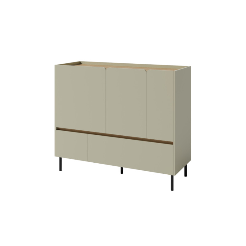 Za třemi dveřními čely se nacházejí uzavřené police, které umožňují pohodlné uložení větších předmětů, jako jsou textilie, dokumenty v pořadačích, nádobí nebo doplňky do domácnosti. Nad střední částí nábytku se nacházejí dvě zásuvky stejného formátu, které umožňují uložení menších předmětů: klíčů, nabíječek, dokumentů, poznámkových bloků nebo jiných každodenních doplňků, ke kterým se vyplatí mít rychlý přístup.