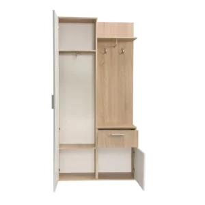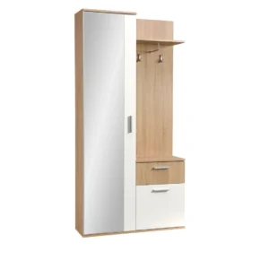 Velmi praktická a prostorná skříň do předsíně. Ve skříni je prostor na zavěšení bund i na uložení bot. Kromě toho je vybaven praktickou zásuvkou, do které můžete uložit šály, rukavice nebo klíče od domu. Na toaletním stolku je zrcadlo, ve kterém se na sebe můžeme podívat. Šatní skříň je navíc vybavena policemi, kam můžeme odložit například klobouky nebo čepice. Velkou výhodou skříně je, že je univerzální, jde o to, kde je namontována zrcadlová část, může být buď vpravo, nebo vlevo. Dostupné barvy: dub lanýžový,dub lanýžový+alpská bílá,dub sonoma,dub sonoma+alpská bílá,dub artisan,dub artisan+černá.