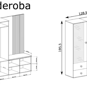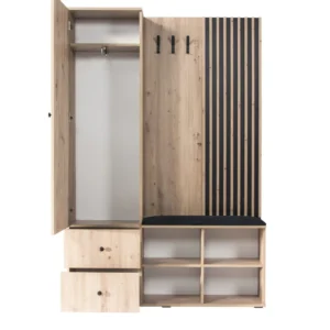 Nowoczesna garderoba z lustrem w jasnym kolorze dąb artisan do przedpokoju. Idealne połączenie z kolekcją CALI, gdzie wchodząc do mieszkania mamy przedsmak nowoczesnego stylu z wykorzystaniem lameli, idąc dalej, do salonu możemy przedłużyć tym samym stylem wystrój naszego wnętrza. Mebel jest niesamowicie funkcjonalny, ma wygodne półki na buty, dwie szuflady w których możemy schować podręczne rzeczy takie jak czapki, czy rękawiczki. Nad szafkami znajduje się obszerna szafa do wieszania ubrań. Garderoba ma wygodne, tapicerowane siedzisko w czarnym kolorze, które pasuje do tła na których są lamele. Swoje kurtki czy płaszcze możemy powiesić na trzech, metalowych wieszakach, które są tak skonstruowane, ze możemy powiesić na nich aż sześć ubrań, każdy na osobnym wieszaku.