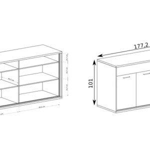 Duża komoda o szerokości aż 177 cm. Dolna część to dwie szafy z podwójnymi drzwiami. W każdej z nich znajduje się półka do przechowywania. Komoda posiada dwie szuflady, otwierane na dotyk, które wysuwają się na prowadnicach. Zawiasy, jakie zastosowano w drzwiach, to najwyżej jakości zawiasy z cichym domykiem, solidne, metalowe. Czarne uchwyty i ozdobna listwa dookoła mebla tworzy ciekawe połączenie z jasną płytą mebla. Kolor najbardziej zbliżony do naturalnego koloru drewna. Komoda pasuje do sypialni, salonu, czy pokoju młodzieżowego, jest uniwersalna i bardzo pojemna. Nowoczesny, industrialny styl. Wykorzystać ją możemy również jako szafa w jadalni do trzymania talerzy, pięknej wazy czy świątecznych dekoracji.