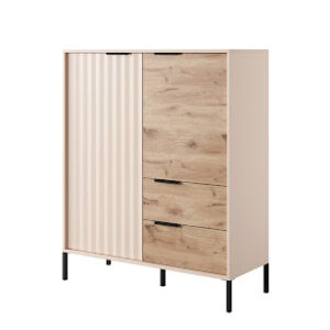 Połączenie naturalnego odcienia dębu artisan z głębią modnej czerni przyciągnie uwagę zwolenników niebanalnych wnętrz. Kolekcja RAVE swoje piękno zawdzięcza również ryflowanym frontom z MDF-u, czarnym, matowym uchwytom, umieszczonym niesymetrycznie, oraz smukłym, metalowym nóżkom, dodającym lekkości. Te meble są zaproszeniem do świata nieszablonowego, ale niezwykle przytulnego i zjawiskowego.