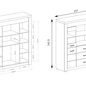 Duża komoda, która dobrze sprawdzi się w twoim domu. Posiada trzy pojemne szuflady oraz pięć półek, na których będzie można przechować ozdoby, pamiątki, zestawy porcelany, drobiazgi i nie tylko. Szklane fronty uczynią ją oryginalną oraz nadadzą świetnej atmosfery w pokoju. Możliwa jest opcja z pełnymi frontami. Komoda zrobiona jest z grubych i dobrych jakości płyt laminowanych oraz metalowych uchwytów, które podkreślają solidność mebla. Istnieje możliwość dokupienia oświetlenia blatu oraz szklanych półek.Dostępna w trzech wybarwieniach:Jesion jasny,Jesion ciemny,Kraft biały