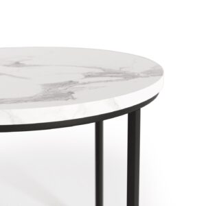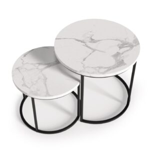 Zestaw 2 okrągłych stolików kawowych OREO zaskoczy swoją funkcjonalnością i jakością wykonania każdego miłośnika funkcjonalnych rozwiązań.Stoliki kawowe wykonane są z płyty MDF okleinowanej w kolorze biały marmur i osadzone są na metalowych podstawach malowanych proszkowo na kolor czarny, wysoce odpornych na uszkodzenia mechaniczne i korozję. Blat z płyty MDF jest odporny na zarysowania i ścieranie. Atrakcyjne wybarwienie biały marmur w połączeniu z czarną podstawą tworzą niezwykły duet, idealny do nowoczesnych aranżacji.