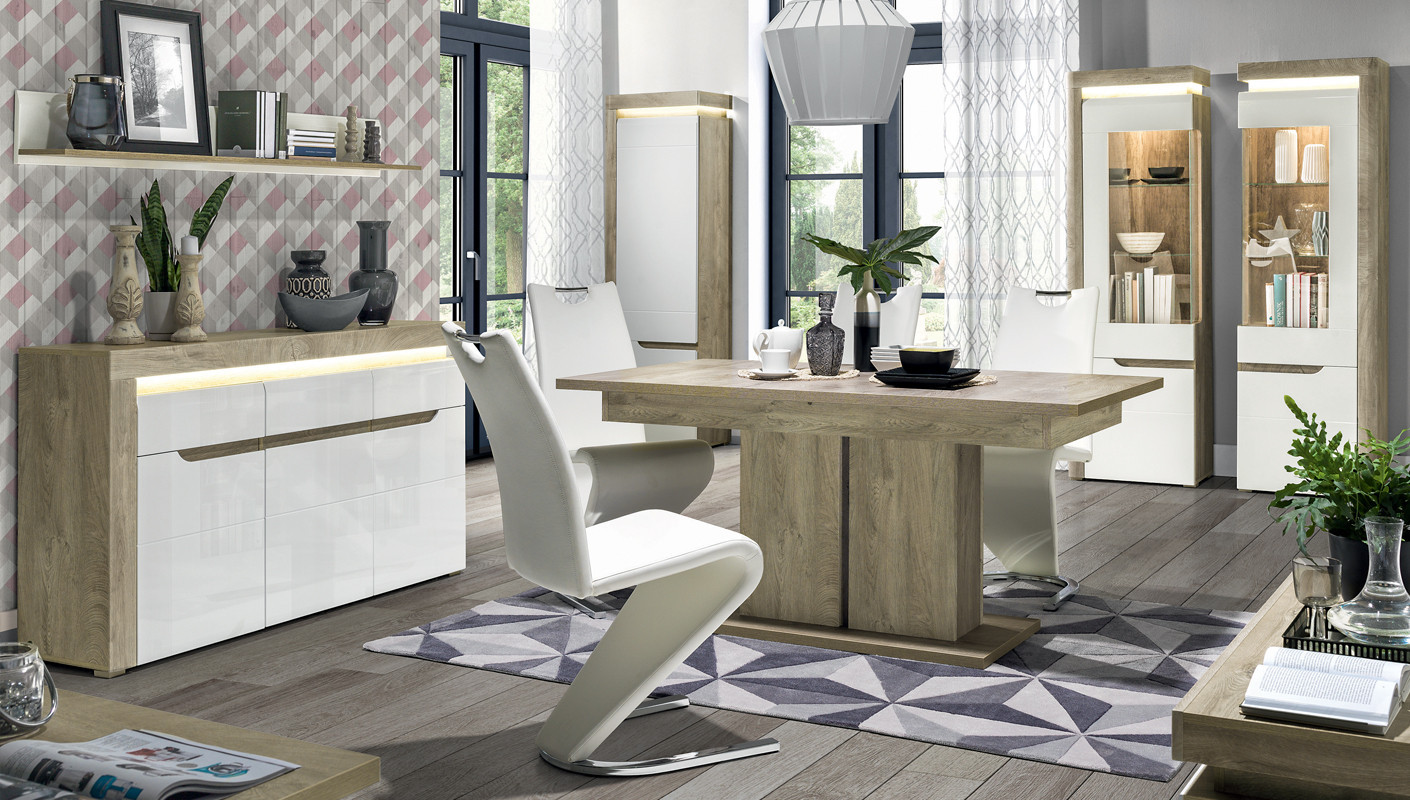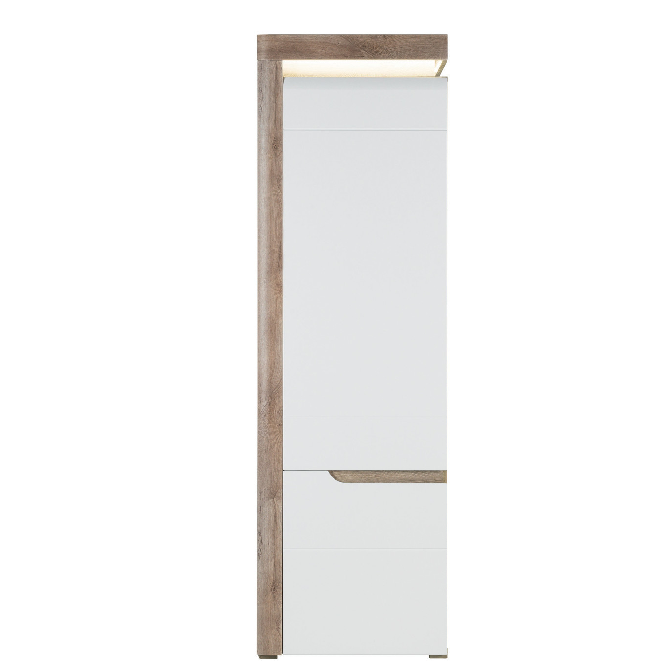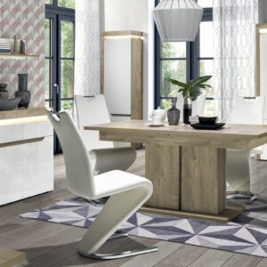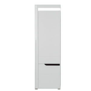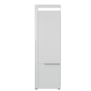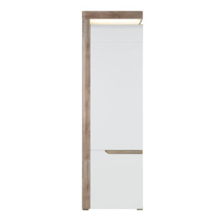 Regał IRMA IM08 to uniwersalny i funkcjonalny element aranżacji przeznaczony do salonu lub sypialni. Smukła budowa z zamykanymi półkami sprawia, że doskonale nadaje się do przechowywania elementów zastawy, dokumentów oraz drobnych elementów garderoby. W szafce zainstalowano system cichego domyku drzwi oraz energooszczędne oświetlenie LED wieńca górnego o barwie białej zimnej. Efektowne podfrezowania na frontach, które zastąpiły tradycyjne uchwyty podkreślają swym kształtem całość stylistyki szafki. Klasyczne połączenie matowej i połyskującej bieli doskonale wpisze się w aktualne trendy dodając szafce niesamowitego uroku i świeżości, a odbijające światło wprowadzi do wnętrza odrobinę chłodnego szyku. W standardzie znajdują się dwa kolory wstawek – biały oraz dąb maggia do wyboru wedle własnego uznania. Szafka RTV idealnie sprawdzi się w konfiguracji z innymi bryłami z serii IRMA lub jako pojedynczy mebel, który można dopasować do własnej aranżacji pomieszczenia.
