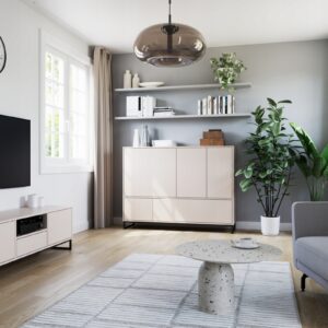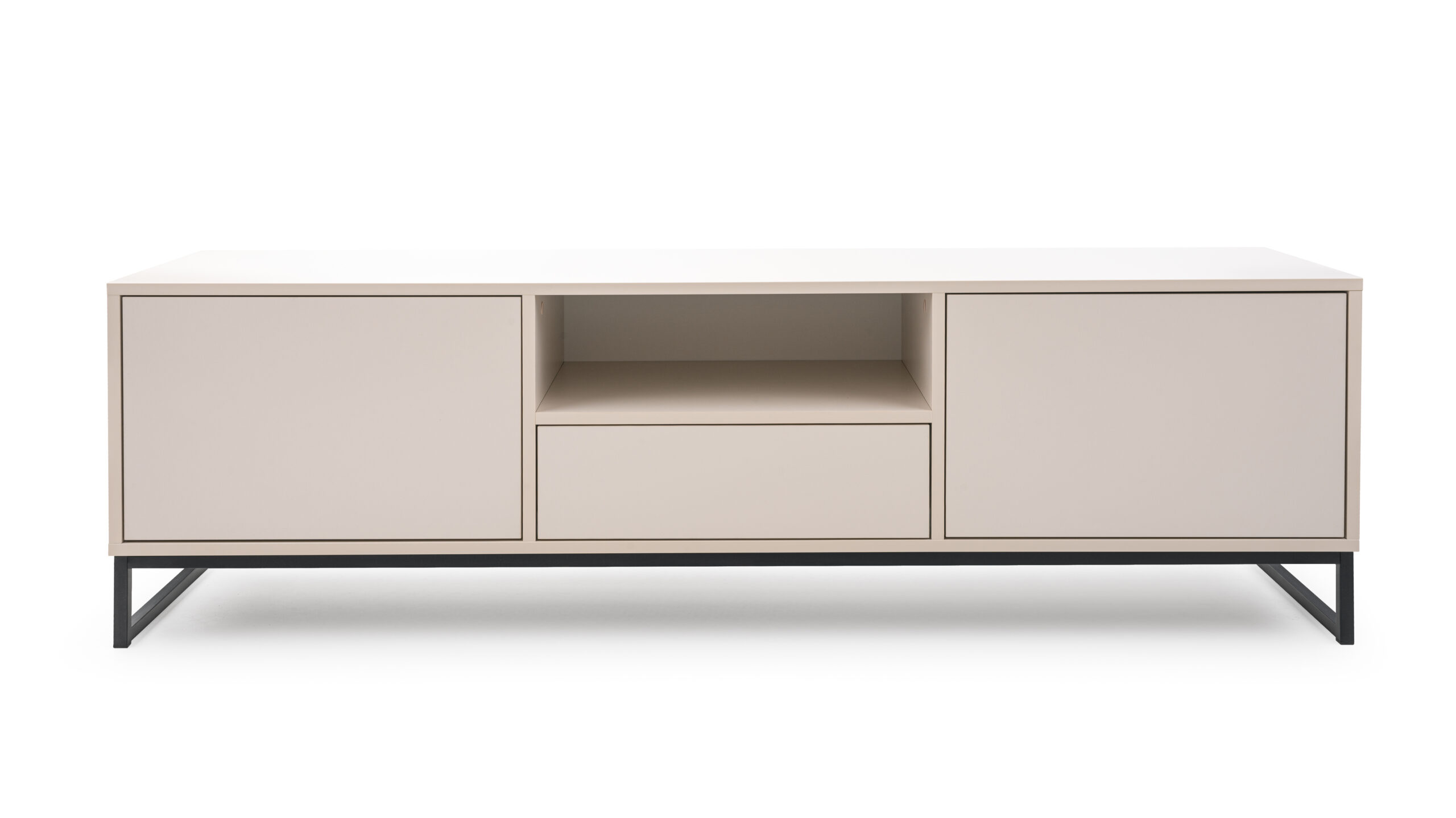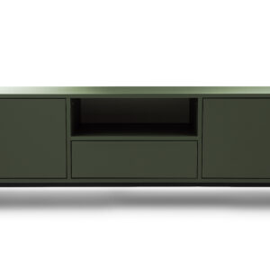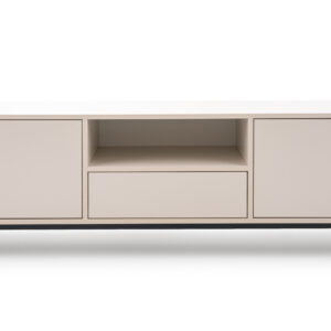 Szafka RTV Genua posiada dwa fronty za którymi znajduje się wolna przestrzeń oraz jedną szufladę i otwartą przestrzeń w środkowej części.