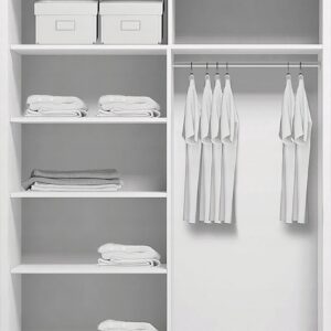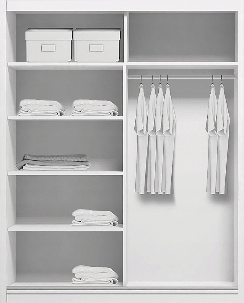 Z lewej strony znajduje się cztery praktyczne półki, idealne do poukładania ubrań czy akcesoriów. Po prawej stronie znajdujemy Ci wygodne miejsce na przechowywanie długich ubrań za pomocą drążka, a nad nim dodatkową półkę idealną na walizkę.