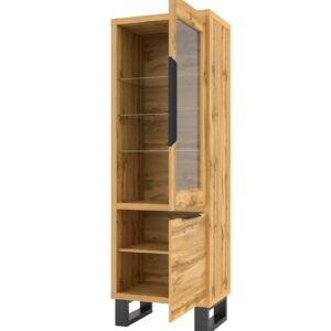 Wnętrze witryny jest funkcjonalnie zaprojektowane, z półkami i przegródkami, które umożliwiają przechowywanie i uporządkowanie różnorodnych przedmiotów. Możesz wykorzystać ją jako miejsce do eksponowania kolekcji książek czy wyposażenia domowego.Kolorystyka:Dąb wotan.